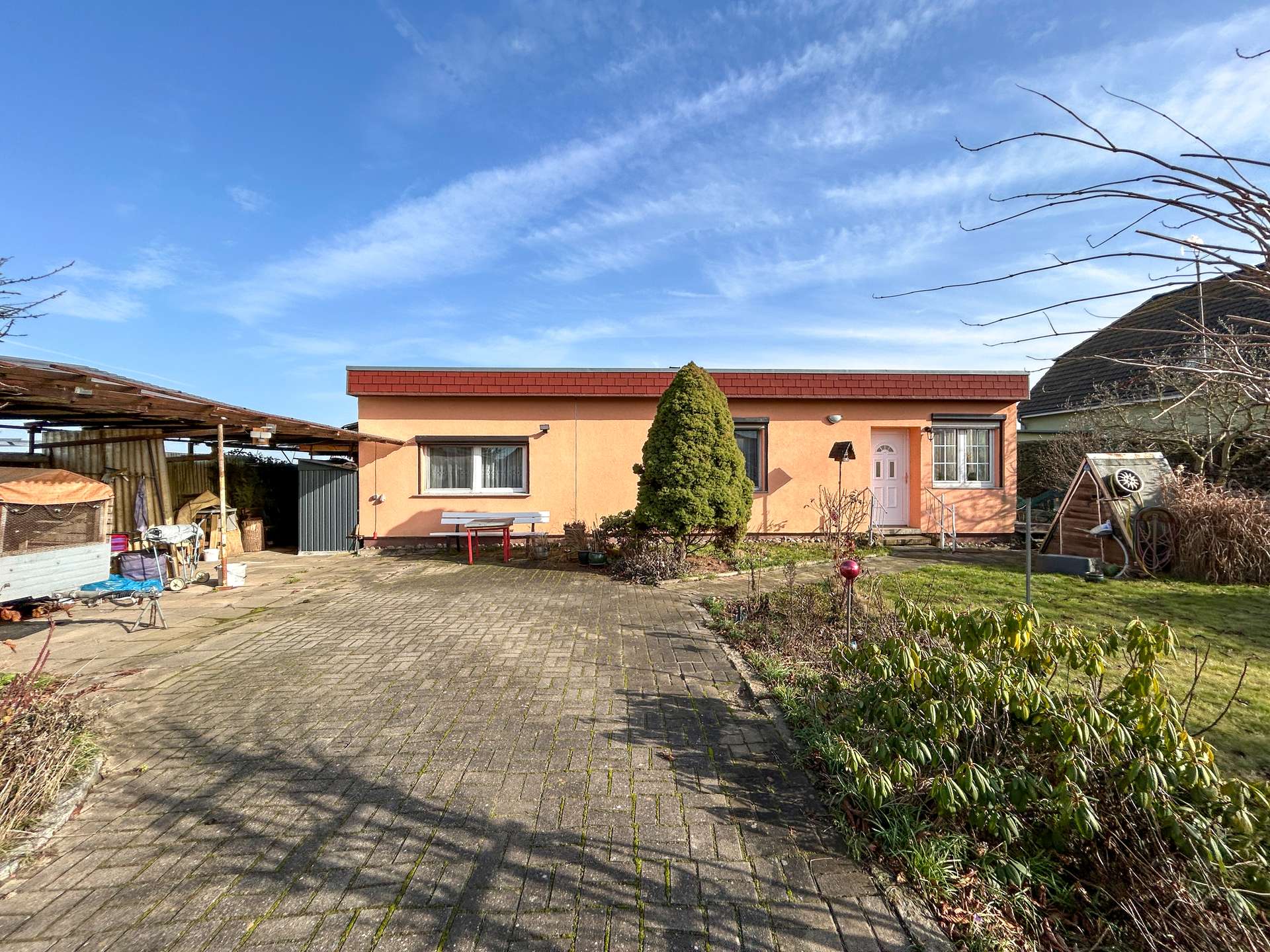 Der Bungalow verfügt über eine bebaute Fläche von ca. 78 m². Vorhanden sind ein Wohnzimmer, ein Schlafzimmer, eine Küche, ein Badezimmer sowie ein Wintergarten, der aktuell als Diele genutzt wird. Der Heizungs- und Hauswirtschaftsraum befindet sich in einem separaten, von außen zugänglichen Gebäudeteil. Innerhalb des Hauses bestehen mehrere Stufen, sodass die Immobilie nicht barrierefrei ist.