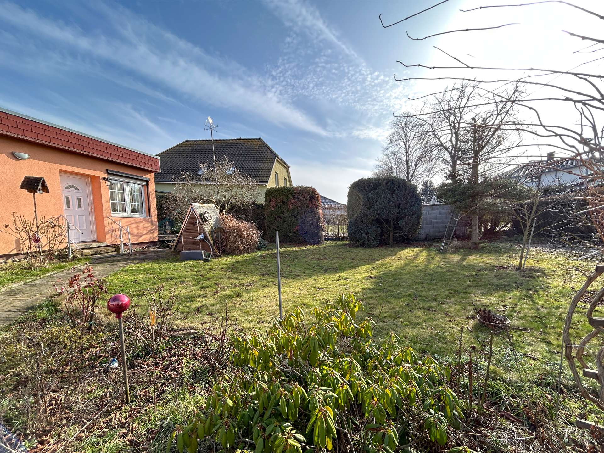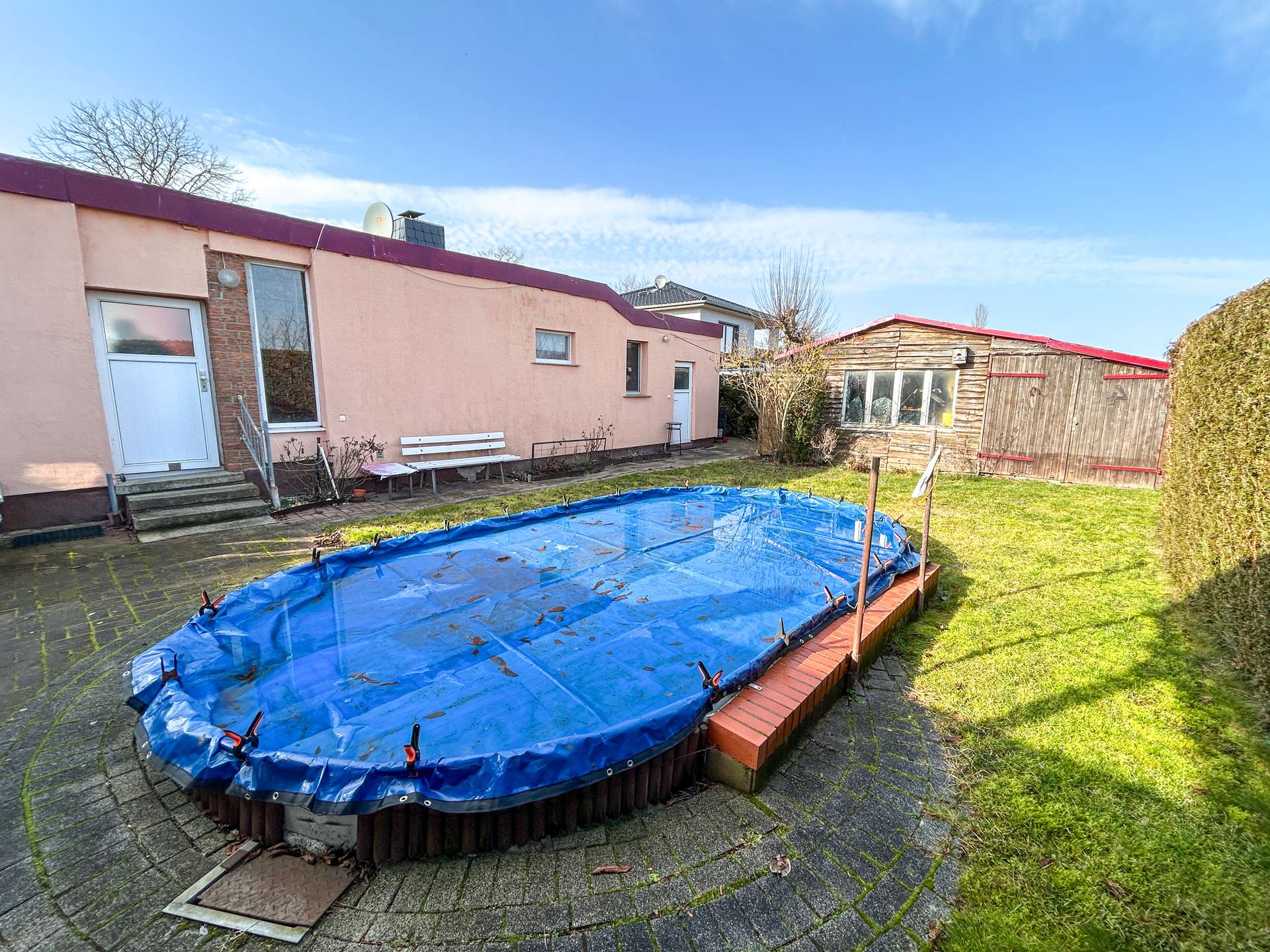 Das Grundstück bietet gleichzeitig gute Entwicklungsmöglichkeiten. Vorhanden sind unter anderem ein Pool, ein Carport, eine überdachte Terrasse sowie ein älterer Teich. Die Außenanlagen befinden sich ebenfalls in einem Zustand, der je nach Anspruch überarbeitet, neu geordnet oder teilweise zurückgebaut werden sollte. Damit bietet das Grundstück Spielraum für eine individuelle Neugestaltung.