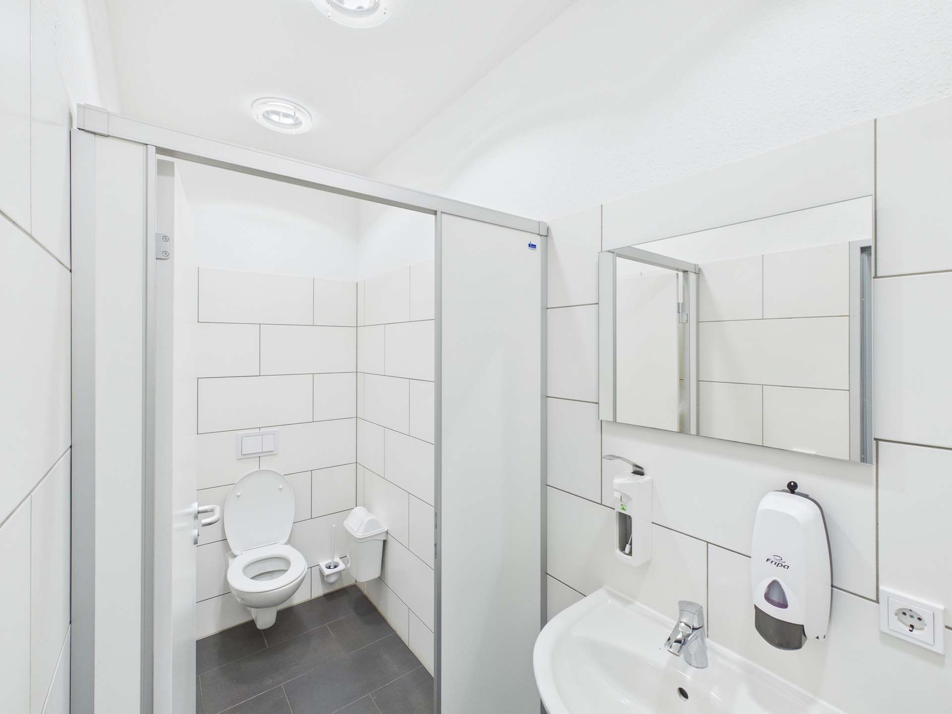 Besonders praktisch ist der vorhandene Sanitärbereich mit mehreren WC-Einheiten, der sowohl für Mitarbeiter als auch für Kunden oder Seminarteilnehmer bestens geeignet ist und einen reibungslosen Betrieb auch bei höherer Mitarbeiterzahl ermöglicht.