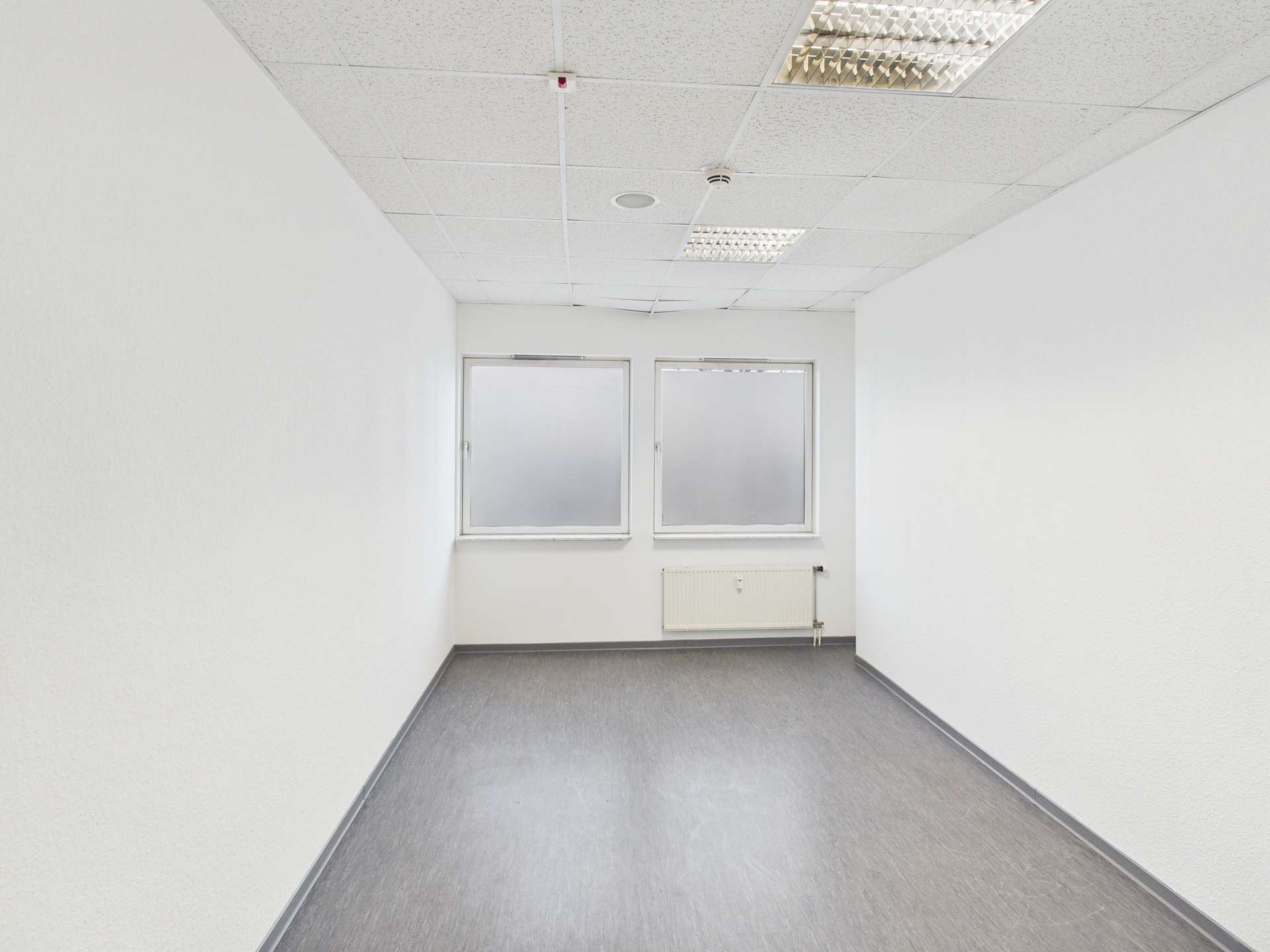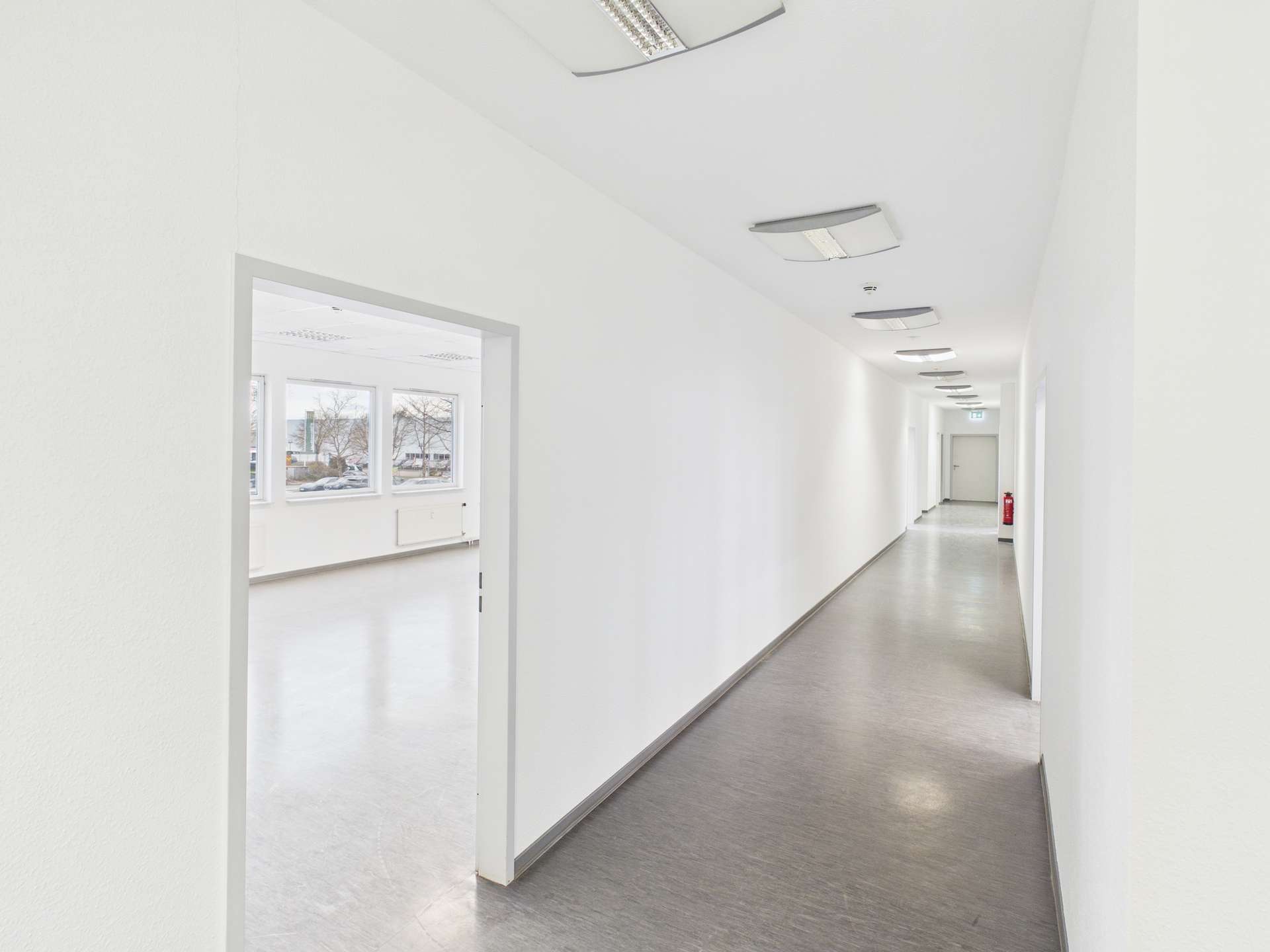Bereits beim Betreten der Fläche gelangt man in einen zentral angelegten Flurbereich, von dem aus alle Räume übersichtlich erreichbar sind. Diese klare Struktur sorgt für eine angenehme Orientierung innerhalb der Gewerbeeinheit und ermöglicht eine effiziente Organisation von Arbeitsabläufen.