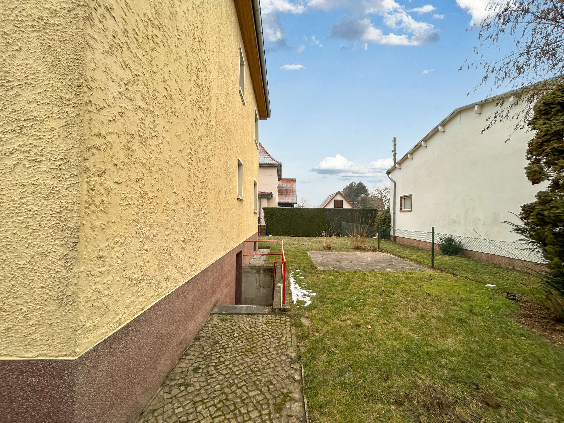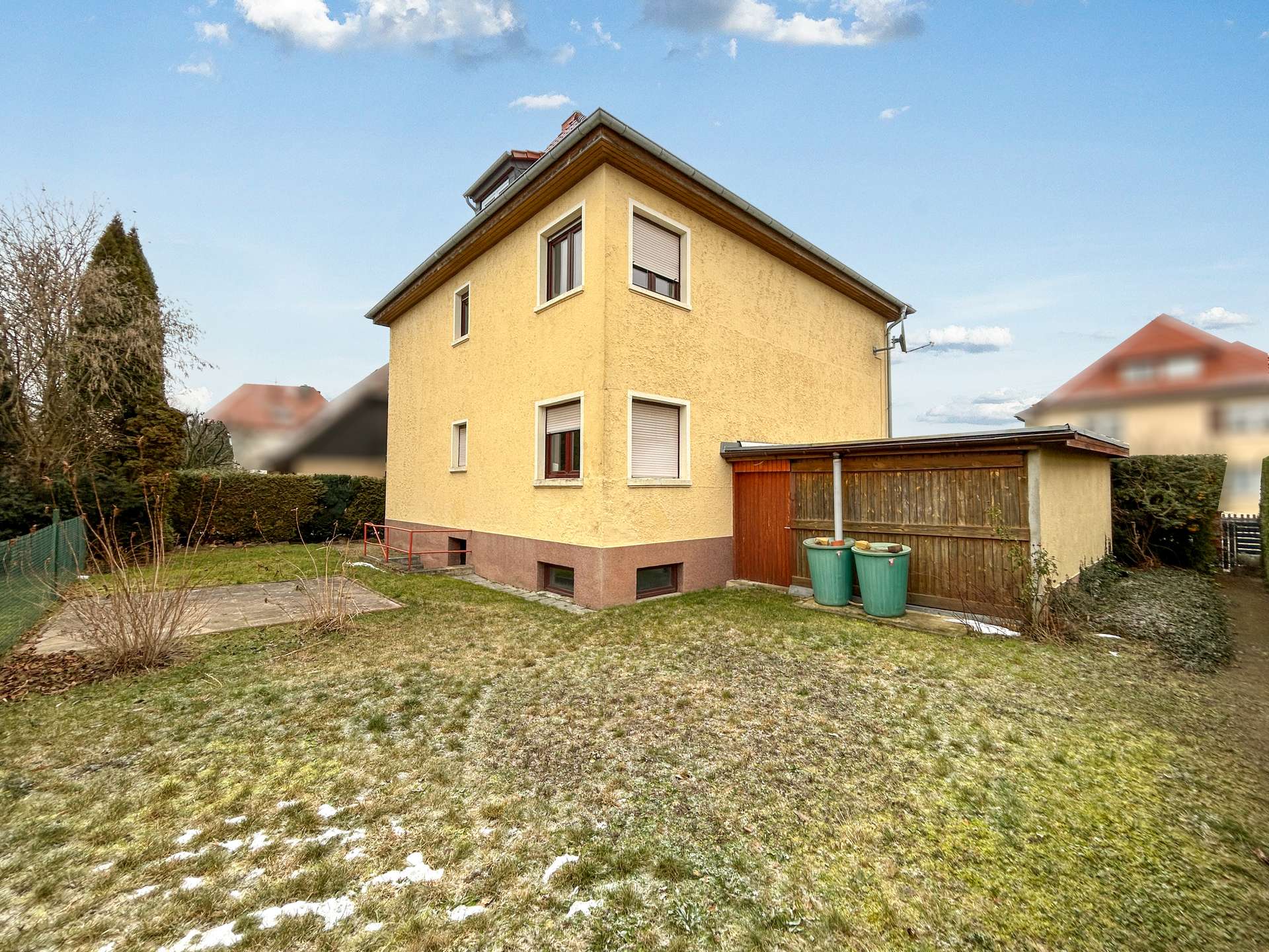 Positiv: Das Haus bietet viel Platz und dank des vorhandenen Treppenhauses auch Gestaltungsspielraum im Grundriss – bis hin zur Option, das Gebäude perspektivisch in zwei Wohneinheiten zu strukturieren (z. B. Mehrgenerationen oder Wohnen + Vermieten). Dazu kommen Vollunterkellerung, Terrasse, Garten und ein Carport.